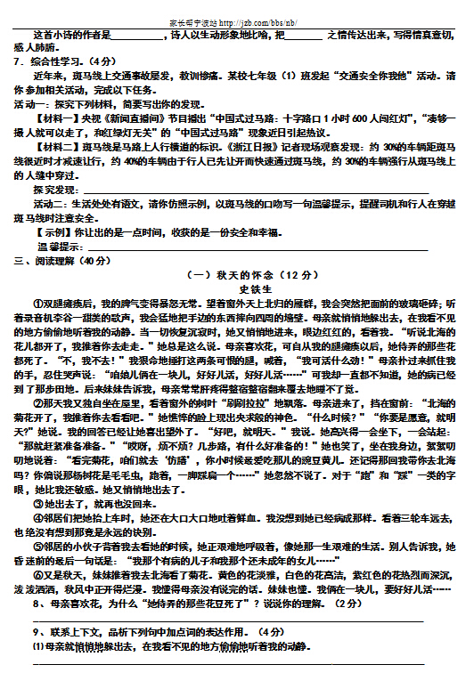 2014-2015年宁波某县市区联考七年级期中语文试题(2)