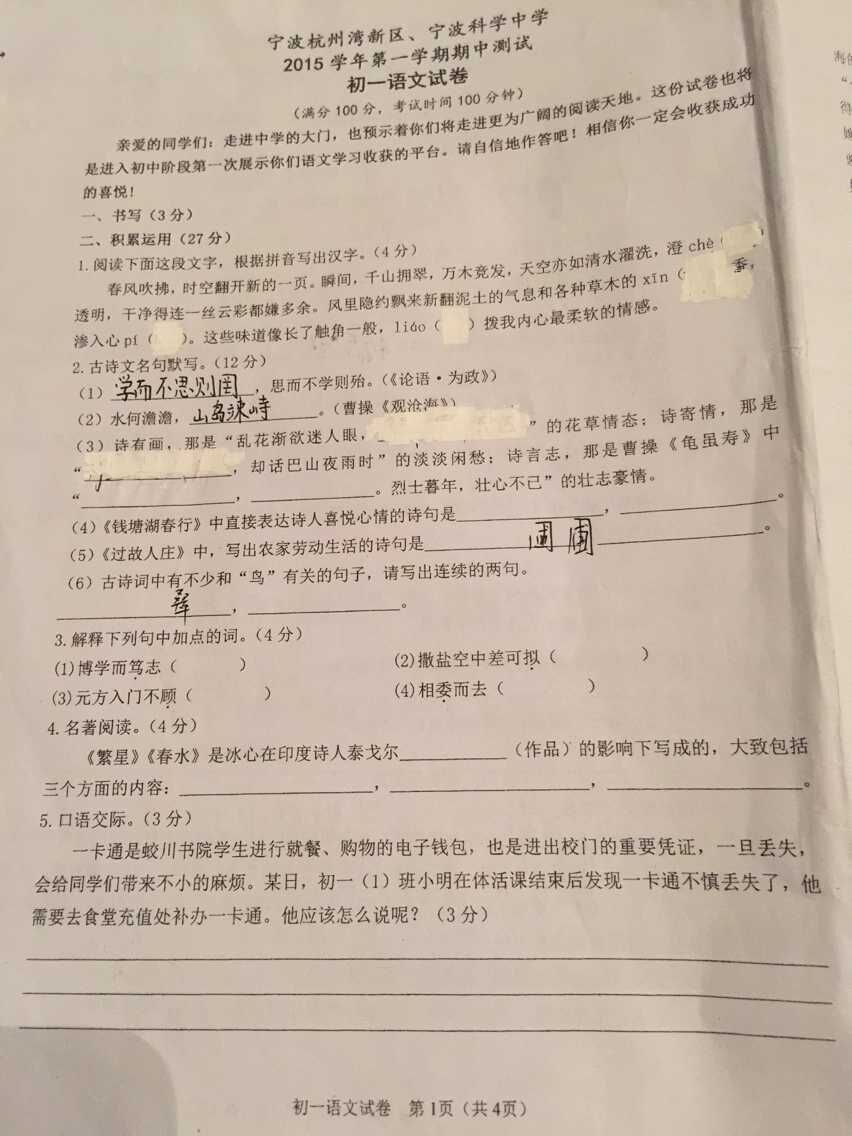 宁波蛟川/科中2015年第一学期初一期中语文试卷