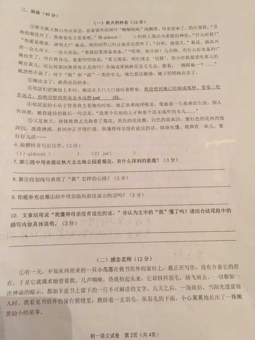 宁波蛟川/科中2015年第一学期初一期中语文试卷(2)